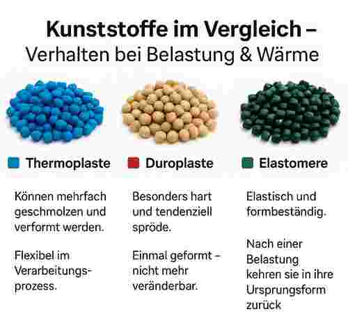 Duroplaste sind hitzebeständig und sehr stabil, Elastomere bieten eine außergewöhnliche Flexibilität und Thermoplaste sind besonders vielseitig.